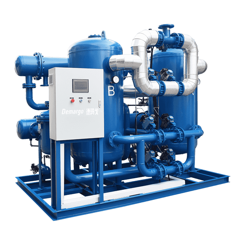 เครื่องเป่าความร้อนของเสียใช้ความร้อนของเสียของเครื่องอัดอากาศที่ปราศจากน้ำมันเพื่อให้ความร้อนและสร้างตัวดูดซับใหม่ มันใช้ประโยชน์จากความร้อนของเสียอย่างเต็มที่ในระบบอากาศอัด นอกจากนี้ยังสามารถทำได้โดยไม่ต้องใช้อุปกรณ์ทำความร้อนผลกระทบของเครื่องเป่าความร้อนสามารถทำได้อย่างเต็มที่แสดงให้เห็นถึงลักษณะการประหยัดพลังงานและประสิทธิภาพสูง จุดน้ำค้างของก๊าซสำเร็จรูปสามารถเข้าถึง -40 ℃ ใช้คอนโทรลเลอร์ PLC ที่พัฒนาด้วยตนเองซึ่งมีความเสถียรและเชื่อถือได้มากกว่าไมโครคอมพิวเตอร์ชิปเดี่ยว วาล์วควบคุมใช้วาล์วผีเสื้อคุณภาพสูงเพื่อให้แน่ใจว่าการสลับมากกว่า 1 ล้านครั้ง การออกแบบ Diverter ขั้นสูงช่วยให้อากาศอัดได้ติดต่อตัวดูดซับอย่างสม่ำเสมอโดยกำจัดปรากฏการณ์ของช่องทาง